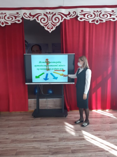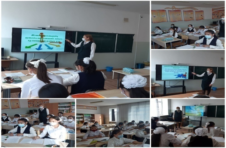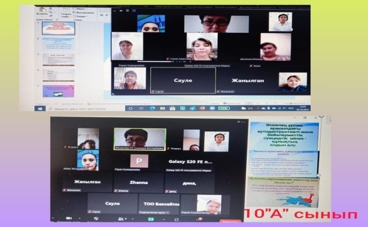 2021 жылдың 18 қазан күні жоспарға сай 8-сынып оқушыларымен аутодеструктивті мінез-құлықының алдын ал мақсатында «Жеткіншектердің аутодеструктивті мінез-құлықының алдын алу» атты мектеп педагог-психологы баяндама оқыды. Баяндама жеткіншектердің аутодеструктивті мінез-құлқының алдын-алу, жат қылықтардан аулақ болу мақтатында өткізілді. Баяндамаға 8 «А», «Ә», «Б», «В» сынып оқушылары қатысты. Оқушылар белсенді қатысып, өз пікірлерін ортаға салды. Жасөспімдерде аутодеструктивті мінез-құлықтың алдын алу бойынша түсінік қалыптастырып, жан-жақты түсіндірілді.