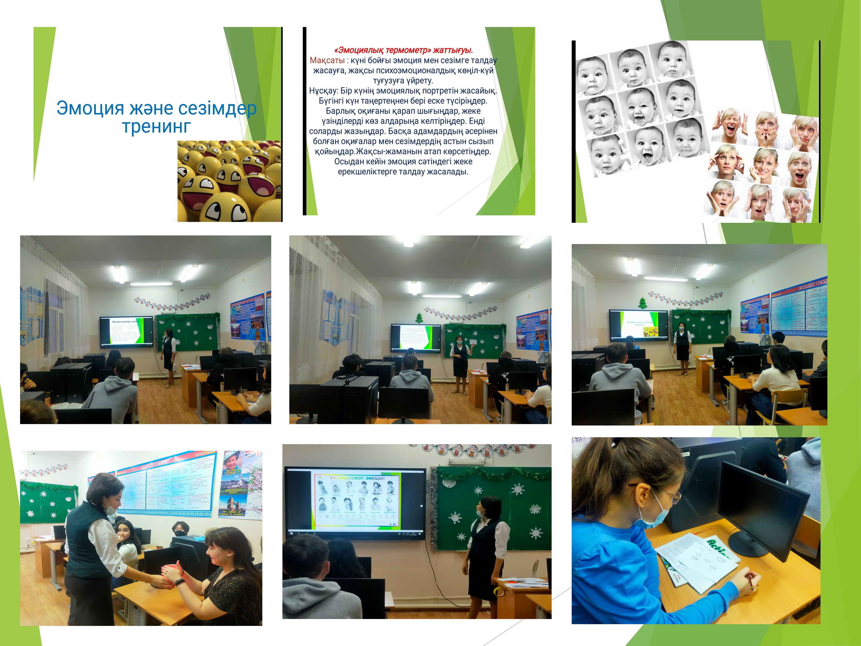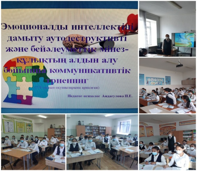 Жасөспірімдер арасындағы аутодеструктивті және бейәлеуметтік мінез-құлықтың алдын алу және өзінің және басқалардың эмоцияларын түсіну қабілетін дамыту негізінде әлемге деген сенімді қарым-қатынасты қалыптастыру, өз эмоциясын бақылау дағдыларын қалыптастыру және айналадағы адамдармен эмоционалды өзара әрекетті дамыту мақсатында «Эмоционалды интелектіні дамыту аутодеструктивті және бейәлеуметтік мінез-құлықтың алдын алу» тақырыбында 7-8-9 сынып оқушылар арасында психологиялық тренинг өтті. «Жан жылыуы» жаттығуы, «Жел кімге қарай соғады?» жаттығу және «Мақтану орындығы» атты жаттығулар жүргізілді. Тренинг барысында оқушылар эмоцияларын ұстап және сезімдеріне талдау жасап үйренді. Көптеген адамдар өз эмоциялары мен сезімдерін ажырата алмайтындығы талқыланды. Оқушыларға аутодеструктивті және бейәлеуметтік мінез-құлықтың алдын-алу бойынша ақпараттық жұмыстар жүргізілді. Тренингке оқушылар белсене қатысып, бойларындағы жағымсыз эмоцияларын шығаруды үйренді. Және де жасөспірімдер аутодеструктивті мінез-құлқы бар оқушыларды қалай анықтау керек екендігін және қалай болдап, көмек қолын созу керек екендігін толықтай түсіндірілді.