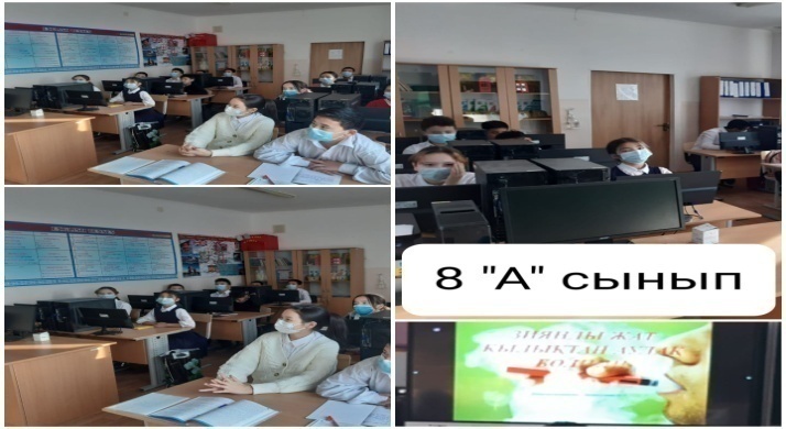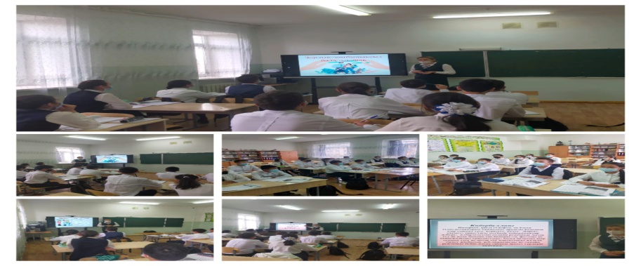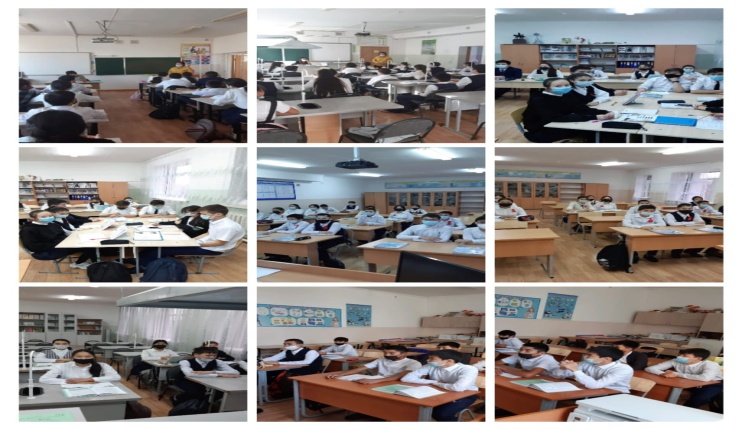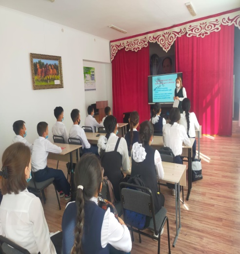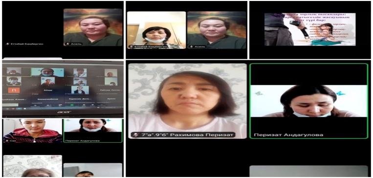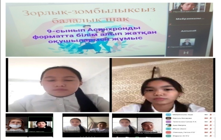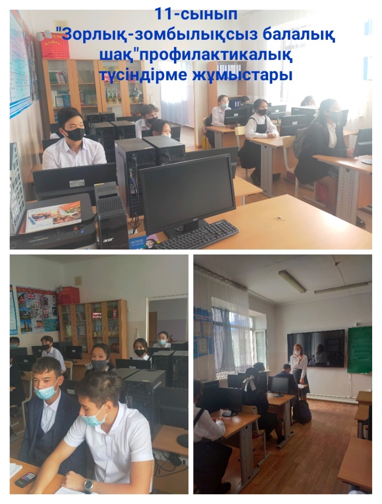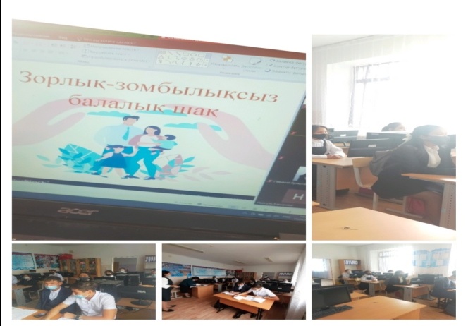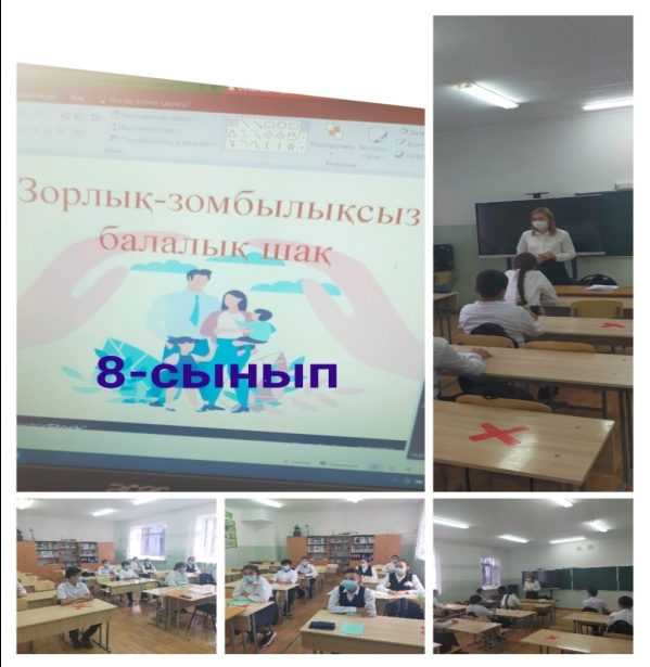 Жоғарыда аталған тақырып бойынша 7-8-9-10-11 сыныптар арасында, оқушылардың зорлық-зомбылықтың құрбаны болудың алдын-алу мақсатында «Зорлық-зомбылықсыз балалық шақ» атты профилактикалық жұмыс атқарылды. 7 сыныптар арасында 60 оқушы, 8 сыныптардан 65 оқушы, 9 сыныптардан 70 оқушы, 10 сыныптардан 37 оқушы және де 11 сыныптар арасынан 27 оқушы қамтылды. 9 «А» және 9 «Б» сыныптарында Асинхронды форматта отырған оқушыларда Зум палтформасымен өткілген іс-шара өз деңгейінде өтті. Оқушылармен кері байланыс жасалында. Мектеп қабырғасындағы оқушылармен өткізілген іс-шараға оқушылар белсені қатысып, көптеген ақпараттармен қамтамасыз етілді.