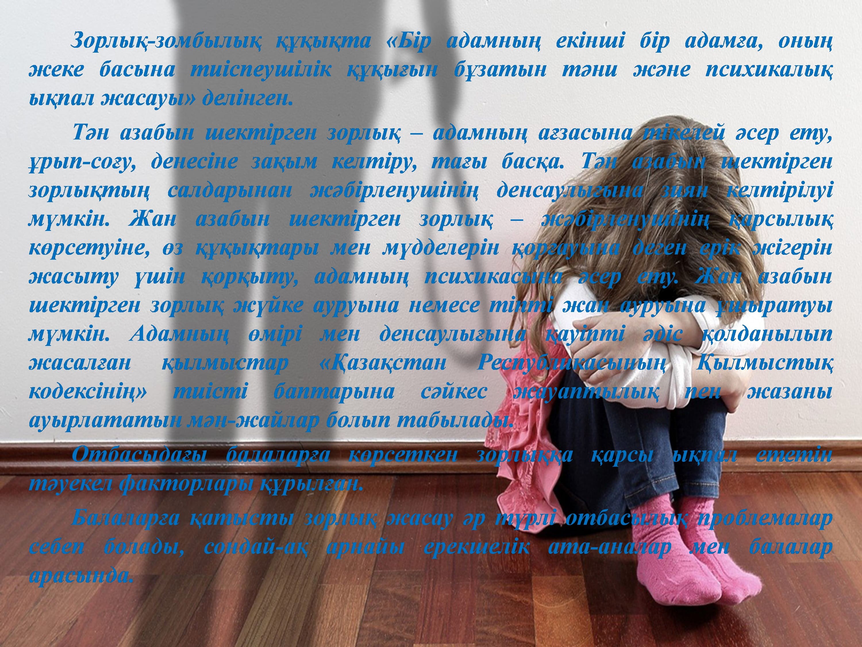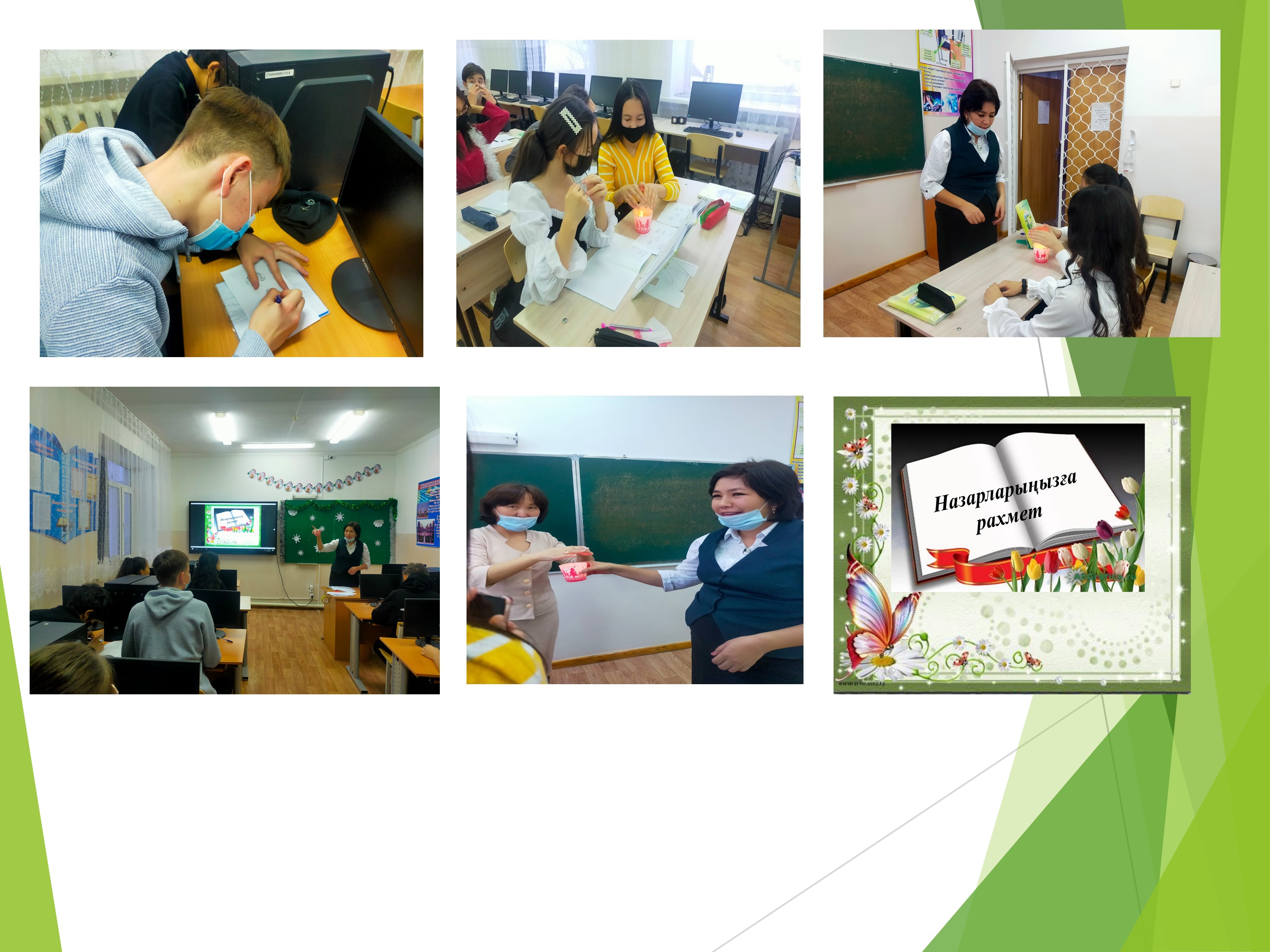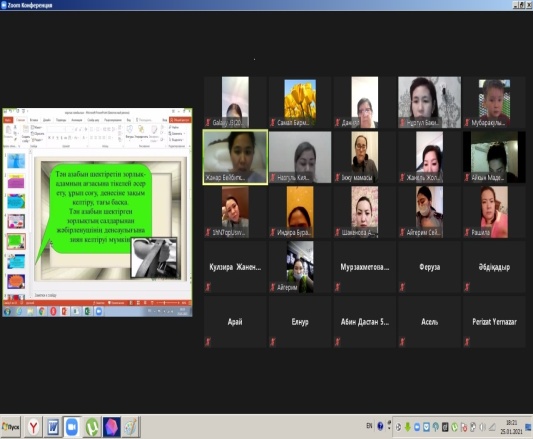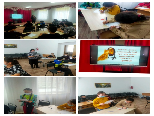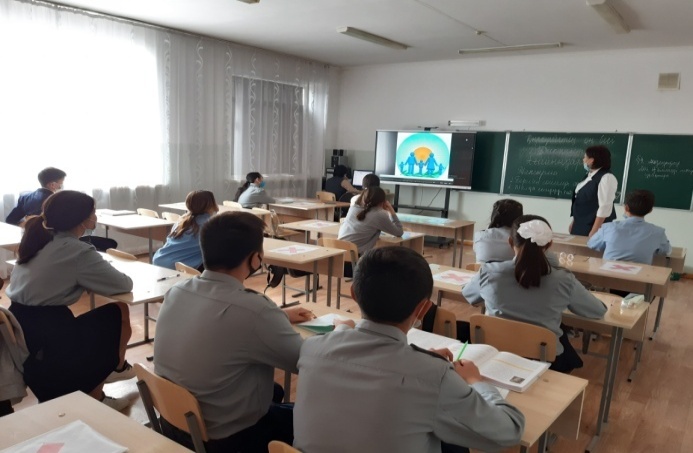 Жоғарыда аталған тақырып бойынша 7-8-9-10-11 сыныптар арасында, оқушылардың зорлық-зомбылықтың құрбаны болудың алдын-алу мақсатында «Зорлық-зомбылықсыз балалық шақ» атты профилактикалық жұмыс атқарылды. 7 сыныптар арасында 60 оқушы, 8 сыныптардан 65 оқушы, 9 сыныптардан 70 оқушы, 10 сыныптардан 37 оқушы және де 11 сыныптар арасынан 27 оқушы қамтылды. 9 «А» және 9 «Б» сыныптарында Асинхронды форматта отырған оқушыларда Зум палтформасымен өткілген іс-шара өз деңгейінде өтті. Оқушылармен кері байланыс жасалында. Мектеп қабырғасындағы оқушылармен өткізілген іс-шараға оқушылар белсені қатысып, көптеген ақпараттармен қамтамасыз етілді.