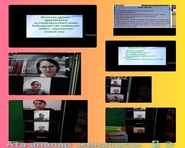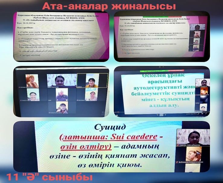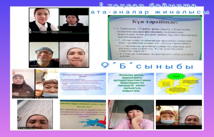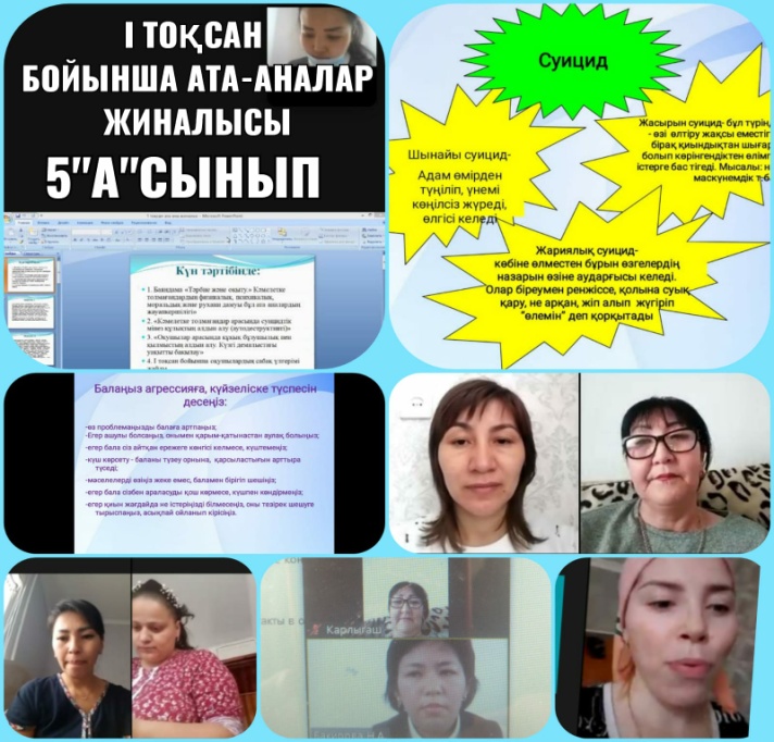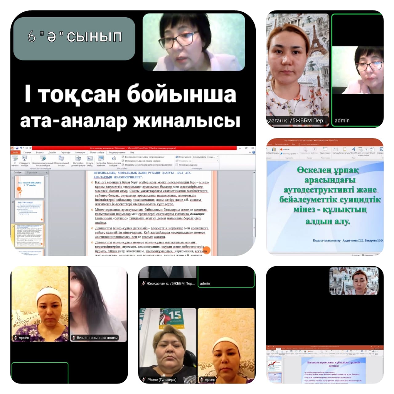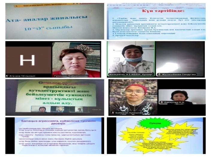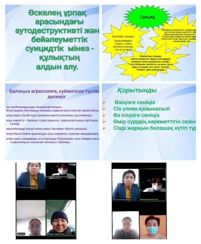 Өскелең ұрпақ арасындағы аутодеструктивті және бейәлеуметтік суицидтік мінез - құлықтың алдын алу мақсатында ата-анамен жұмыстар жүргізілді. «Оқушылар арасында өз-өзіне қол жұмсаудың алдын-алу жолдары» атты баяндама оқылды.