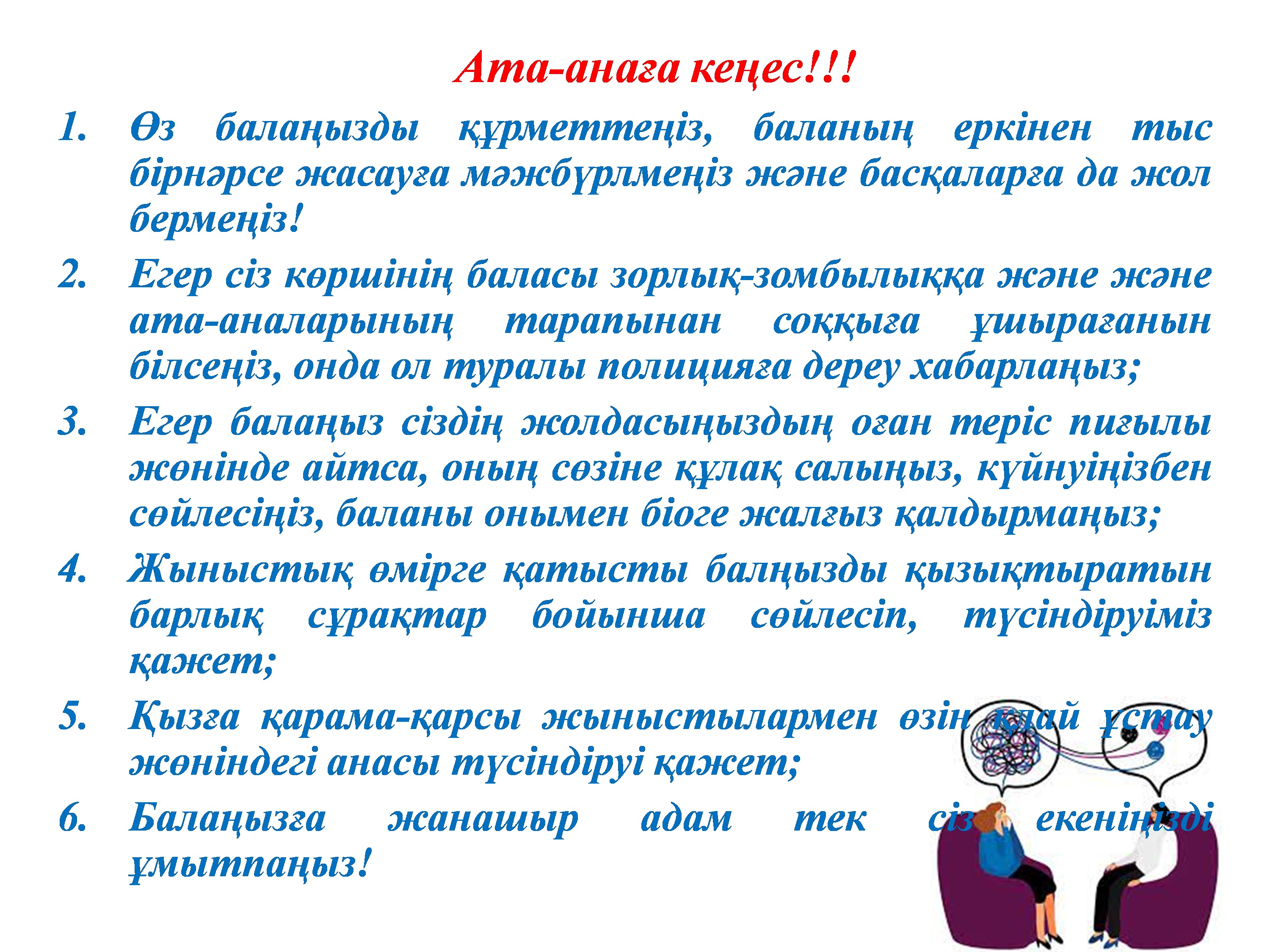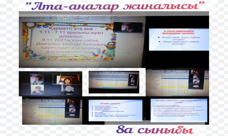 Ата-аналармен мектеп педагог-психологтардыңғ ұйымдастыруымен Жасөспірім арасындағы зорлық - зомбылықтың алдын-алу және балалар арасындағы қатыгездіктің алдын-алу мақсатында «Жасөспірім арасындағы зорлық - зомбылықтың алдын-алу» атты баяндама оқылды. Баяндама барасында ата-анларға оқушының психологиялық физиологиялық денсаулығы туралы айтылды. Кәзіргі танда белең алып отырған сексуалдық зорлық-зомбылықтың алдын-алу шаралары бойынша сөз қозғалды. Жоғарыда айтылған мәлелелер бойынша ата-аналар өз пікірлерімен бөлісті. Баяндама барысында пайдалы кеңестер алғандықтарын жеткізді.