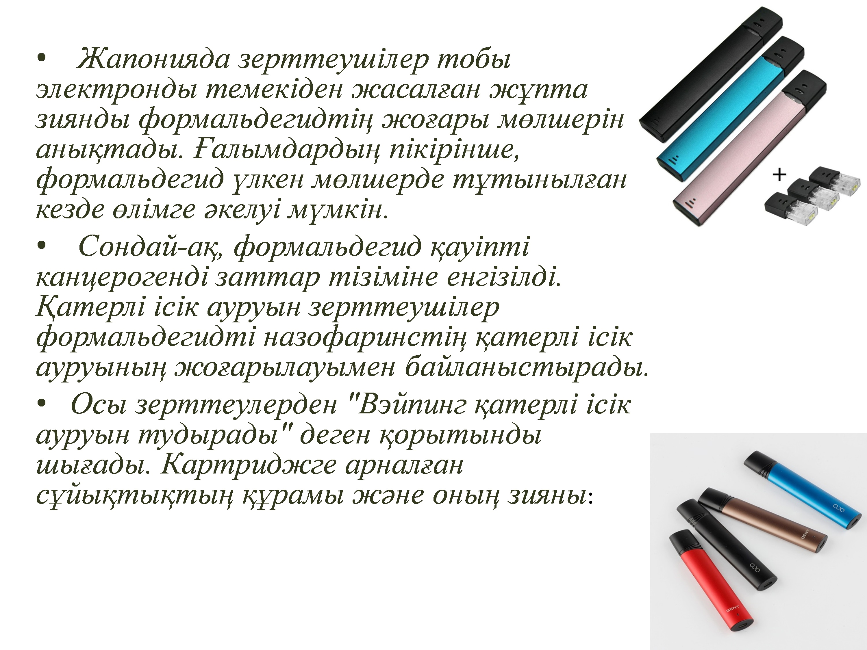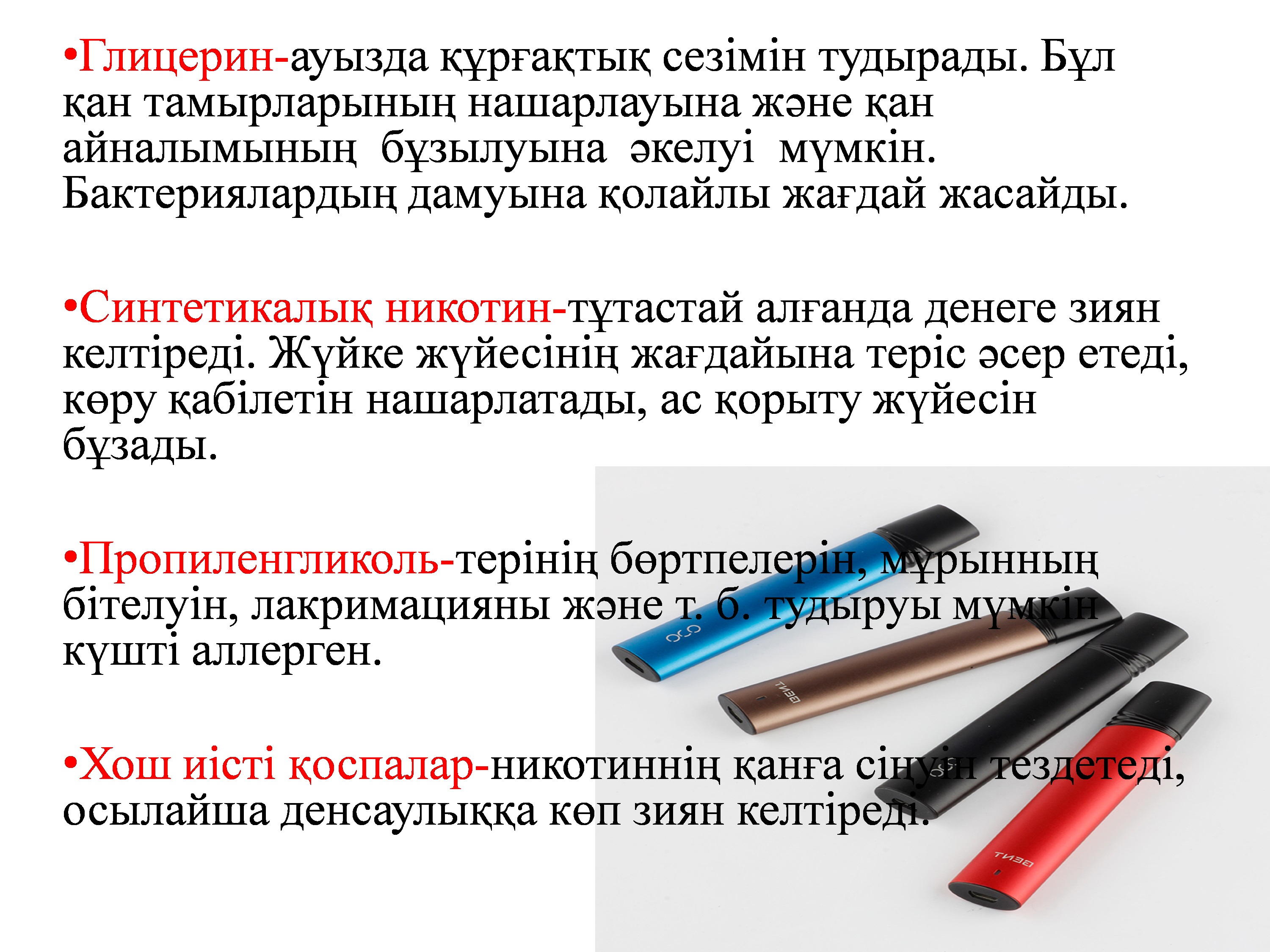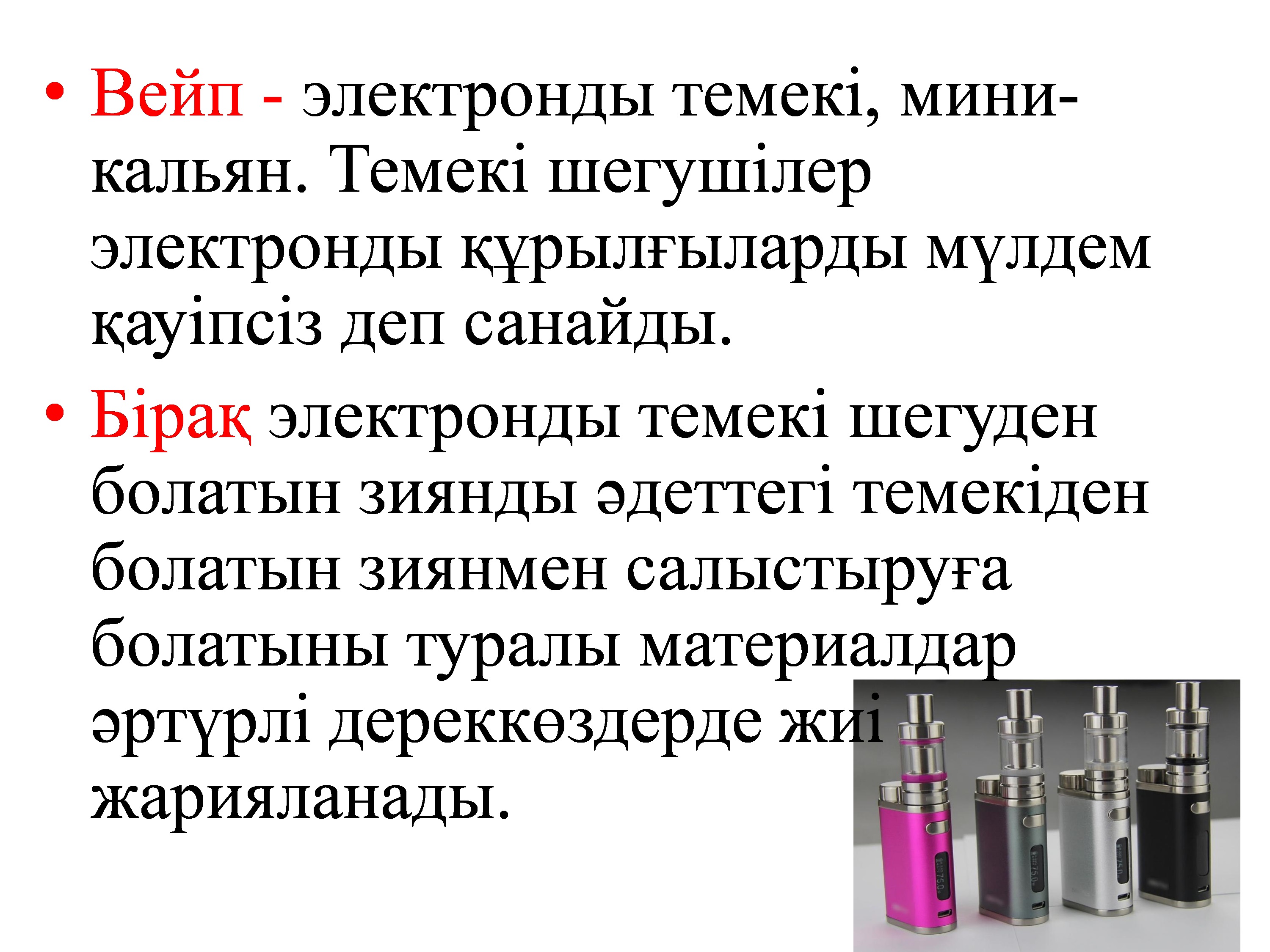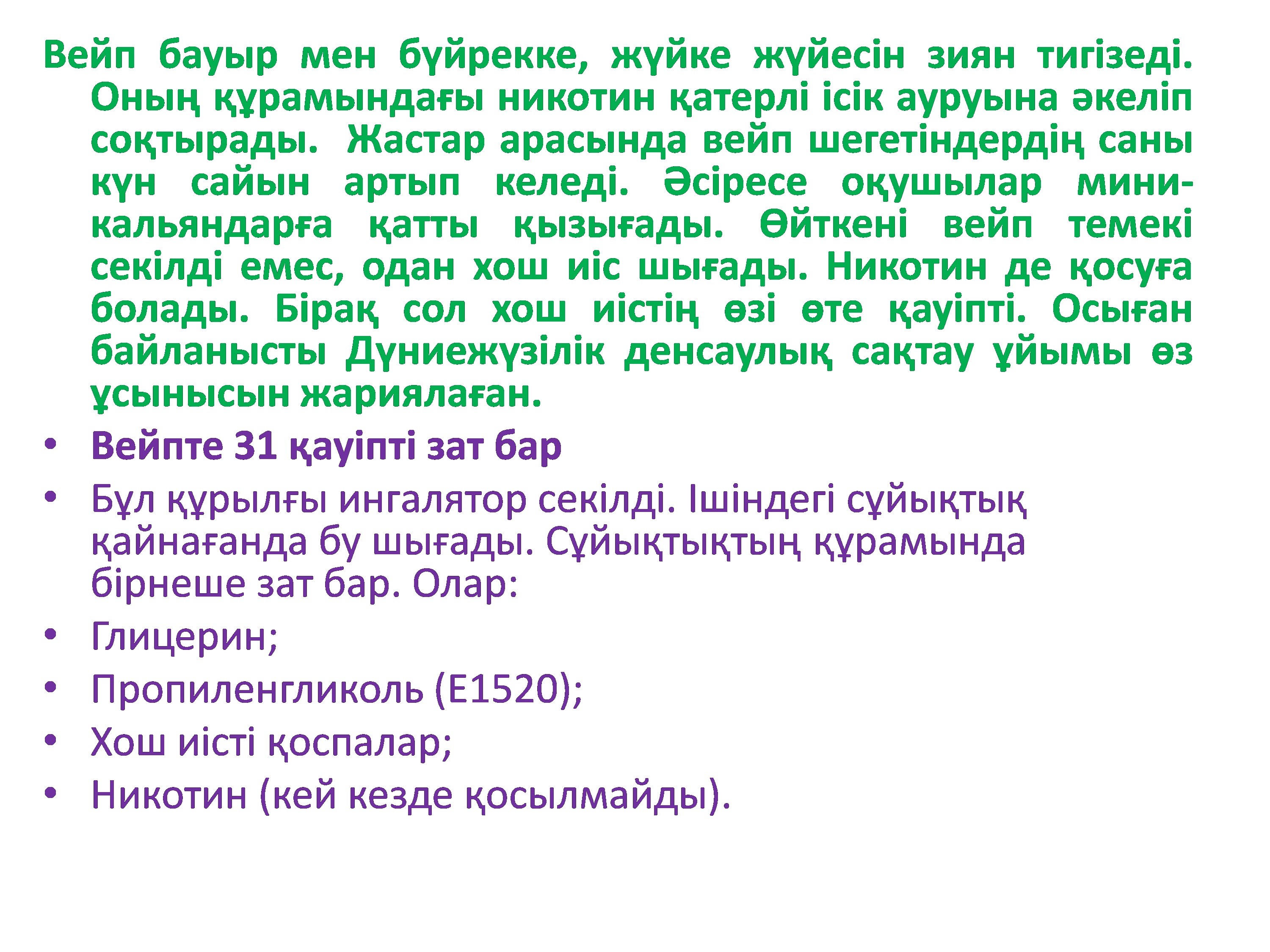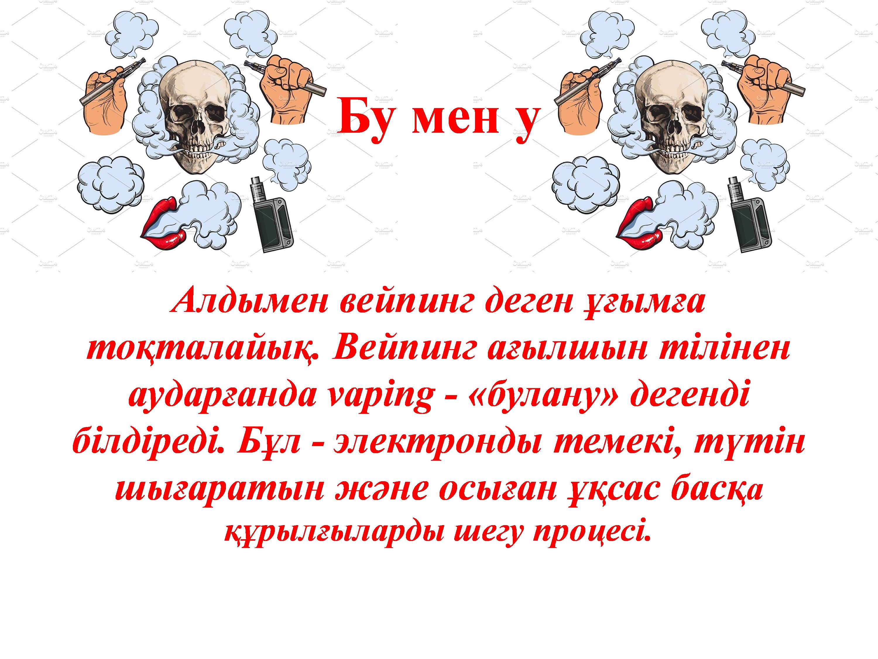 Жоғарыда аталған тақырып бойынша 8 сынып оқушыларына 2021 жылдың 4-ші желтоқсан күні тренинг ұйымдастырылды. Тренигке 8 «А», 8 «Ә», 8 «Б», 8 «В» сынып оқушылары қатысты. Тренингке ойындарына жасөспірімдер өте белсенді қатысты. Қәзіргі Вейп "эпидемиясы" белең алып жатқанын жәнеде оның адам өміріне зияны мен қауіп екенін ортаға салып, талқылады. Вейп құрылғысының ішінде жасырынған химиялық заттармен тасныстып, өлімге алып баратын қадам екенін түсінді. Видео арқылы жасөспірімдердің төсек тартып аурып, тіпіті мүгедектікке шадыққандарына көз жеткізді. Оқушылармен жүргізілген жұмыстардың ақпараты төменде берілген.