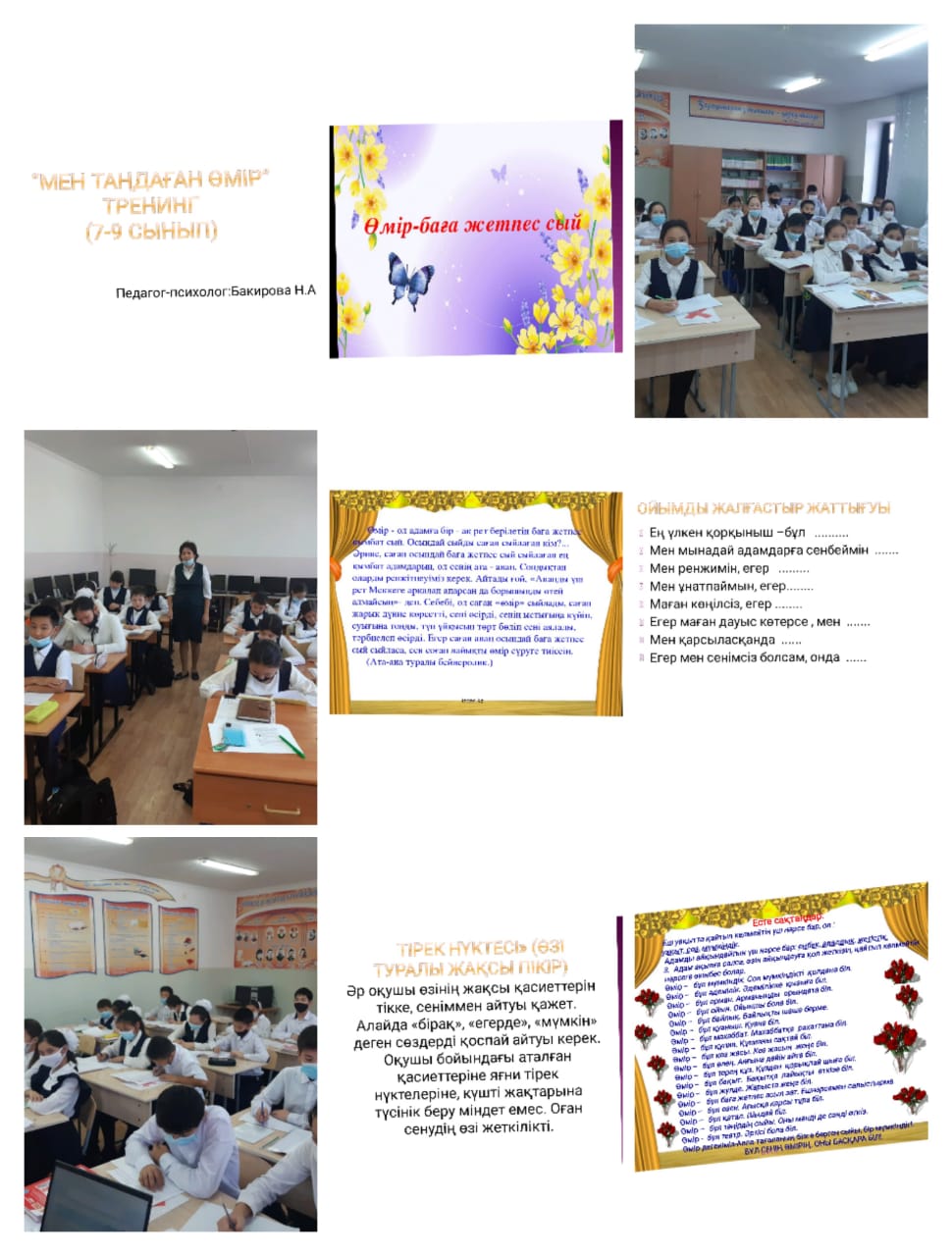 тақырыбында 7-9 сыныптармен тренинг өткізді. Мақсаты : Оқушыларға өмір ұғымын түсіндіре отырып, өмірде кездесетін әртүрлі жағдайлар туралы ақпарат беру.