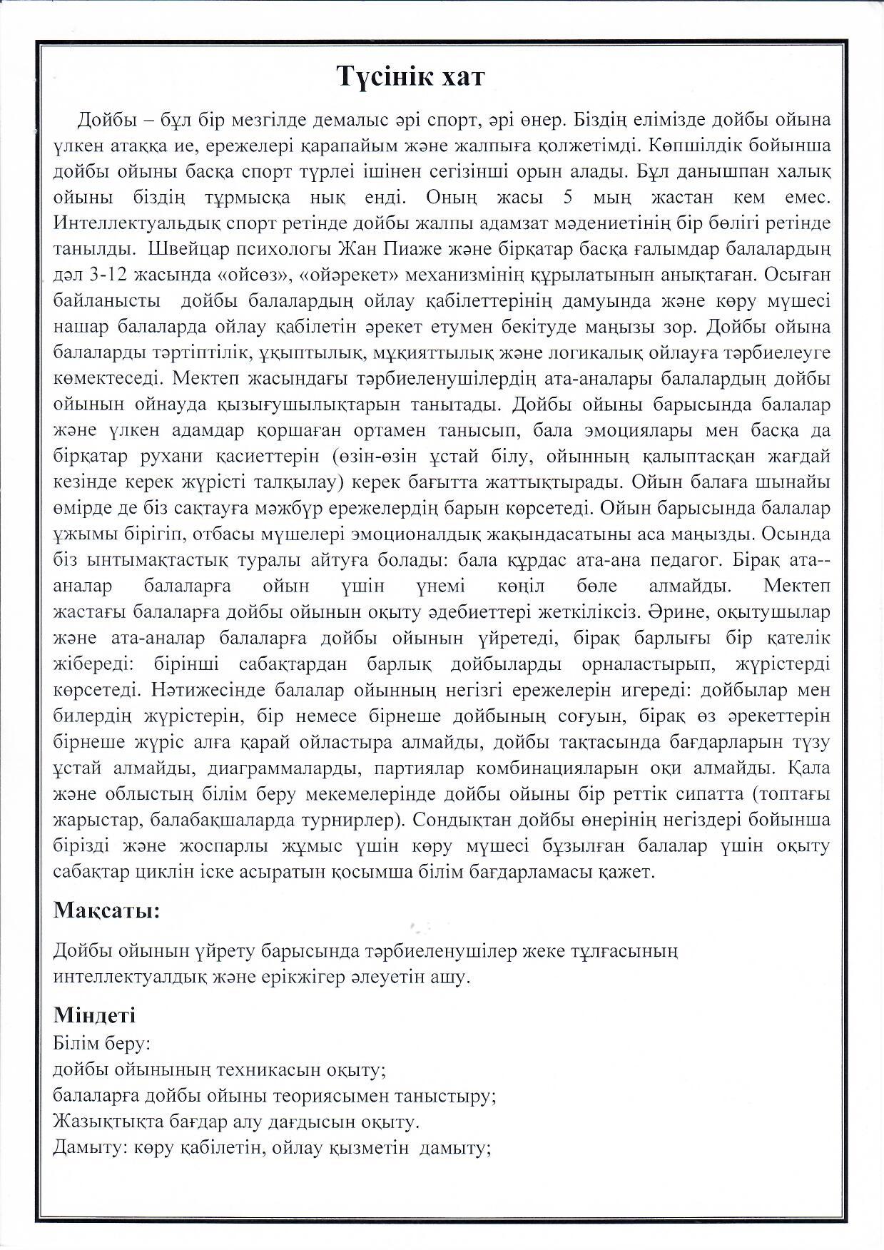 Дойбы – бұл бір мезгілде демалыс әрі спорт, әрі өнер. Біздің елімізде дойбы ойына үлкен атаққа ие, ережелері қарапайым және жалпыға қолжетімді. Көпшілдік бойынша дойбы ойыны басқа спорт түрлеі ішінен сегізінші орын алады. Бұл данышпан халық ойыны біздің тұрмысқа нық енді. Оның жасы 5 мың жастан кем емес. Интеллектуальдық спорт ретінде дойбы жалпы адамзат мәдениетінің бір бөлігі ретінде танылды. Швейцар психологы Жан Пиаже және бірқатар басқа ғалымдар балалардың дәл 3-12 жасында «ойсөз», «ойәрекет» механизмінің құрылатынын анықтаған. Осыған байланысты дойбы балалардың ойлау қабілеттерінің дамуында және көру мүшесі нашар балаларда ойлау қабілетін әрекет етумен бекітуде маңызы зор. Дойбы ойына балаларды тәртіптілік, ұқыптылық, мұқияттылық және логикалық ойлауға тәрбиелеуге көмектеседі. Мектеп жасындағы тәрбиеленушілердің ата-аналары балалардың дойбы ойынын ойнауда қызығушылықтарын танытады. Дойбы ойыны барысында балалар және үлкен адамдар қоршаған ортамен танысып, бала эмоциялары мен басқа да бірқатар рухани қасиеттерін (өзін-өзін ұстай білу, ойынның қалыптасқан жағдай кезінде керек жүрісті талқылау) керек бағытта жаттықтырады. Ойын балаға шынайы өмірде де біз сақтауға мәжбүр ережелердің барын көрсетеді. Ойын барысында балалар ұжымы бірігіп, отбасы мүшелері эмоционалдық жақындасатыны аса маңызды. Осында біз ынтымақтастық туралы айтуға болады: бала құрдас ата-ана педагог. Бірақ ата-аналар балаларға ойын үшін үнемі көңіл бөле алмайды. Мектеп