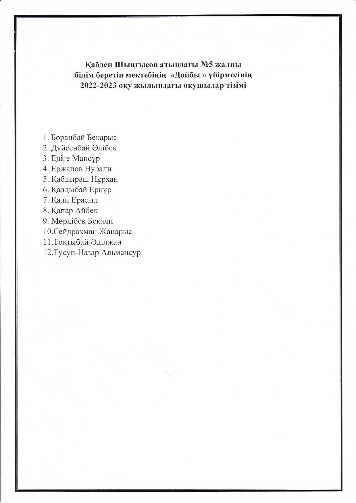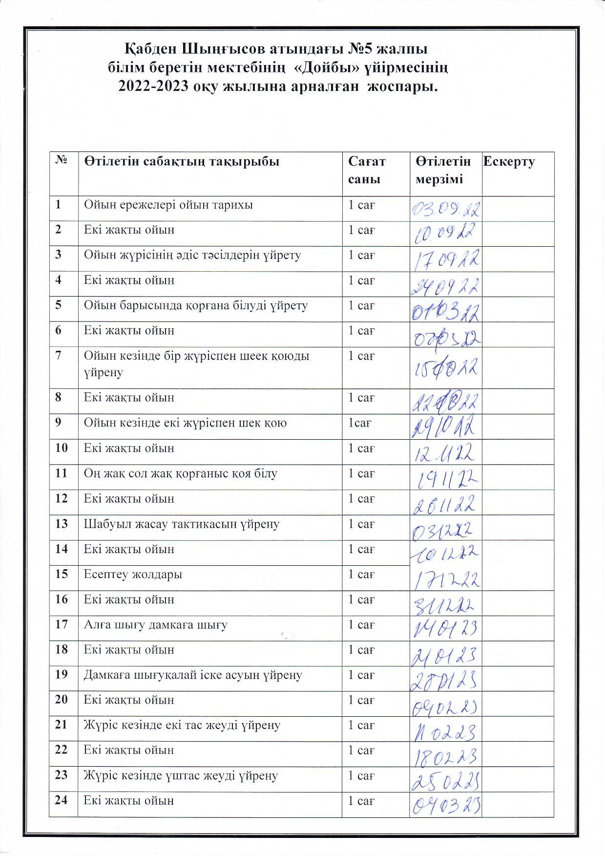 Қабден Шыңғысов атындағы №5 жалпы білім беретін мектебінің дене тәрбиесі пәні бойынша 2022–2023 оқу жылына арналған спорттық дене тәрбиесін ұйымдастыру және өткізу іс шаралар жоспарын орындау мақсатында, 5 сынып оқушыларының денсаулықтарын нығайтуда және ойлау қабілетін арттыруға, дойбы ойынының тәсiлдерiн үйрету үшін, «Дойбы» ойын үйірмесінің жоспары құрылып биылғы оқу жылынан бастап ашылды.