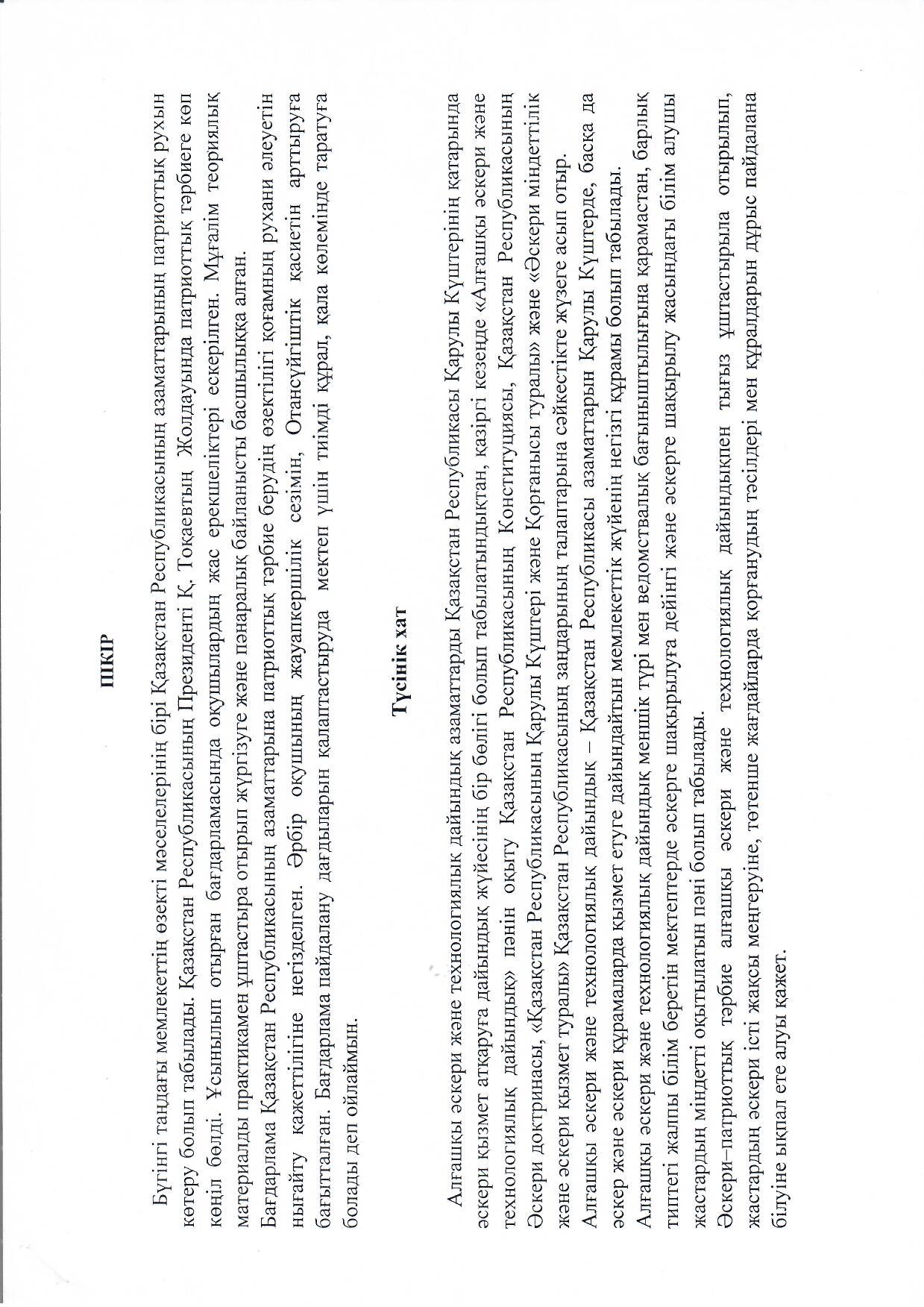 Әскери–патриоттық тәрбие алғашқы әскери және технологиялық дайындықпен тығыз ұштастырыла отырылып, жастардың әскери iстi жақсы меңгеруiне, төтенше жағдайларда қорғанудың тәсiлдерi мен құралдарын дұрыс пайдалана бiлуiне ықпал ете алуы қажет.