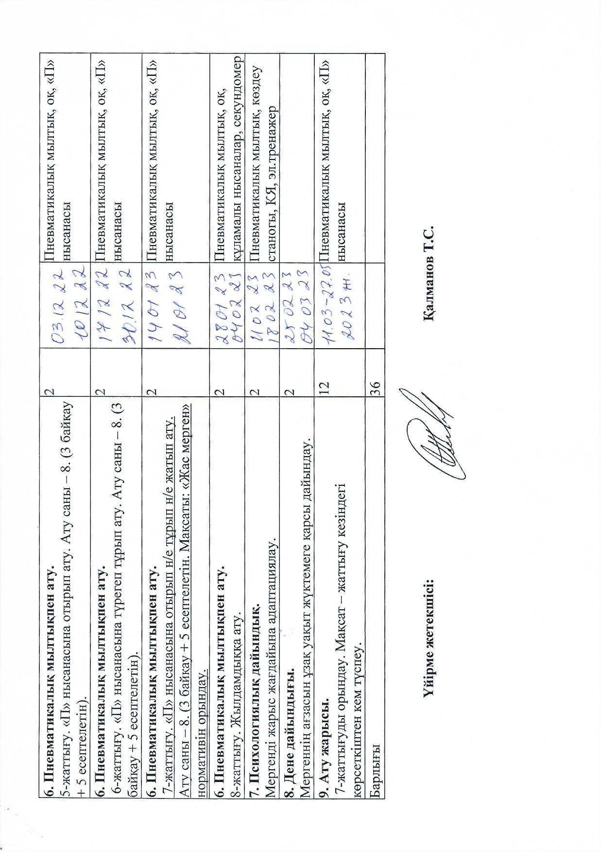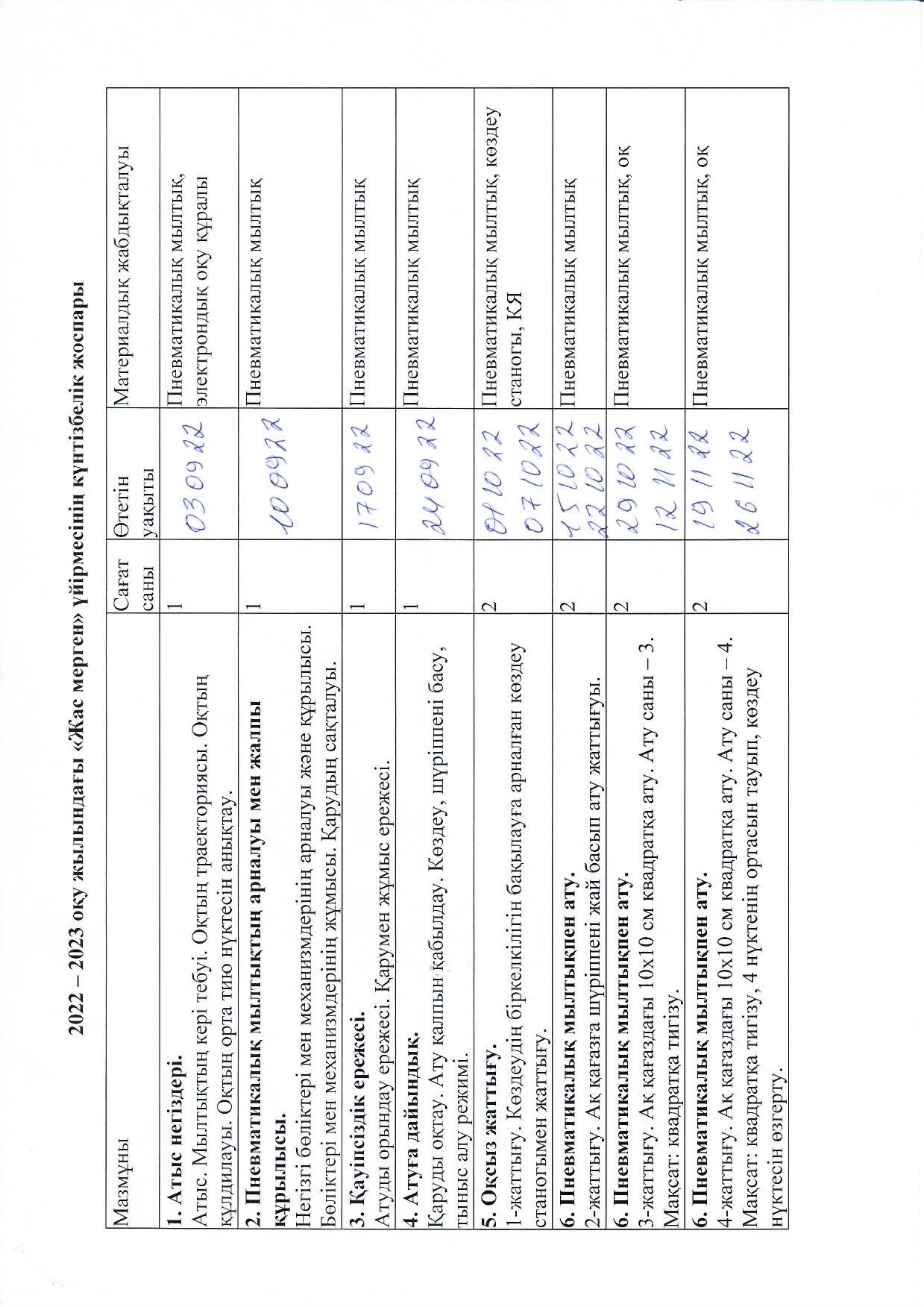 Оқу жылының бірінші жарты жылдығында «Жас мерген» үйірмесінің күнтізбелік жоспарына сәйкес, мылтық атуда қауіпсіздік ережесі, қаруды атуға дайындық, қарумен оқсыз жаттығулар, пневматикалық мылтықпен ату жаттығулары бойынша негізгі тақырыптары практикалық тұрғыда оқытылды