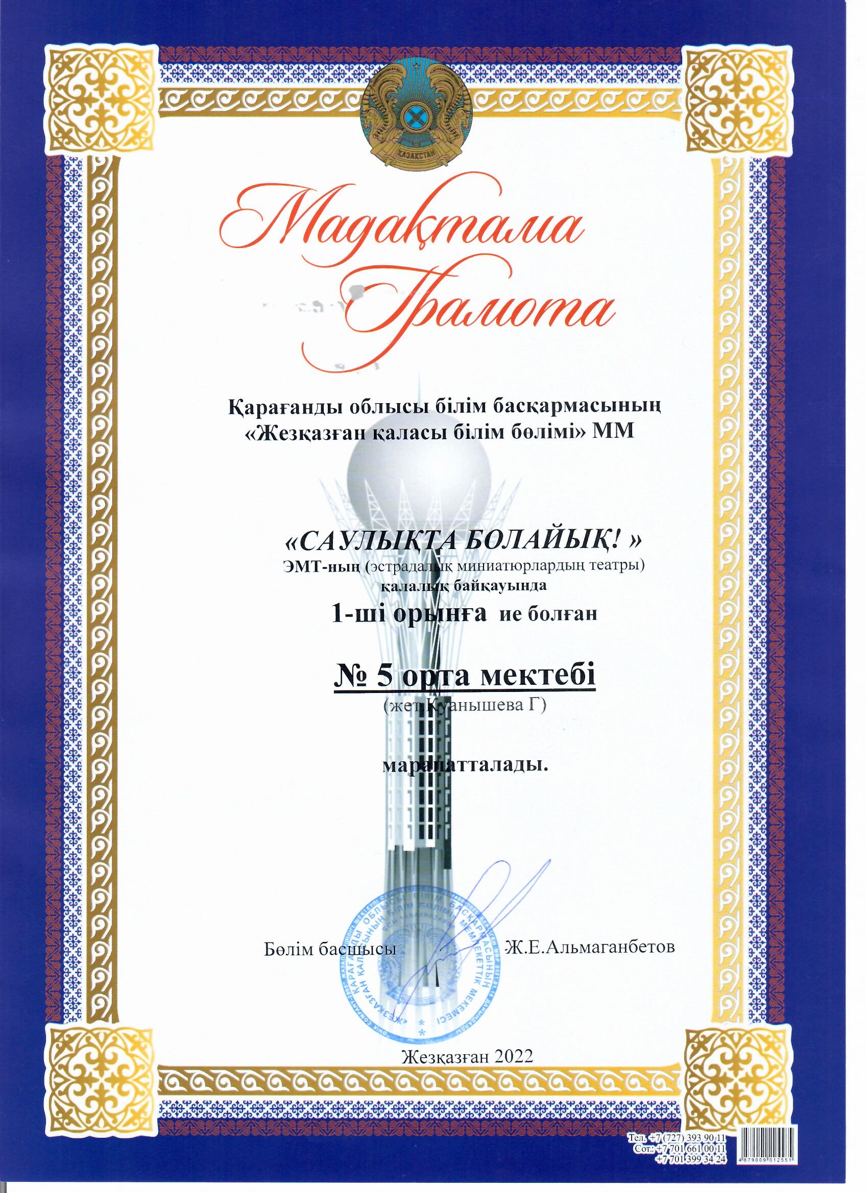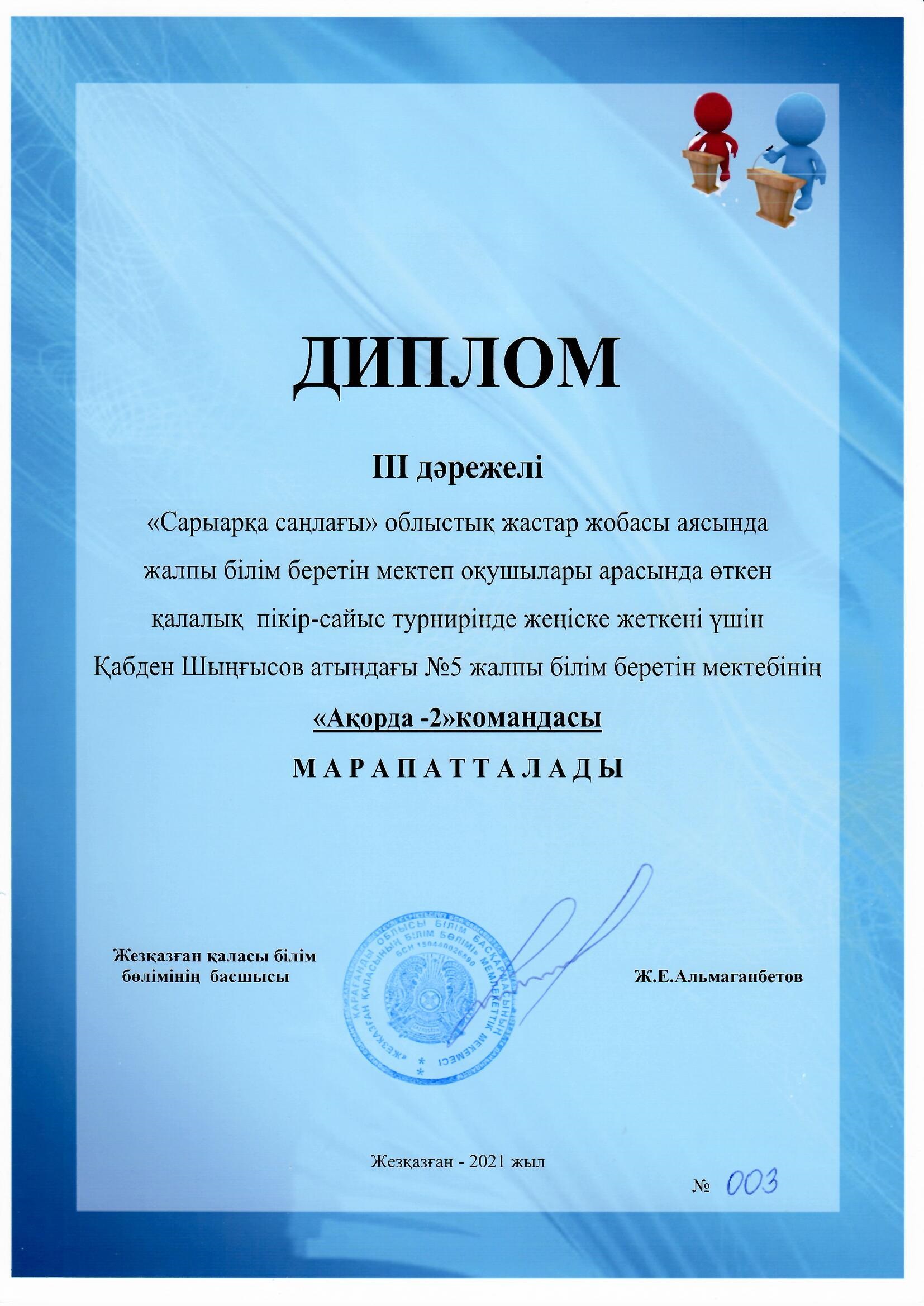 «Сарыарқа саңлағы» облыстық жастар жобасы аясында ҚР Тұңғыш Президент күні және ҚР Тәуелсіздігінің 30 жылдығы мерекелеріне арналған республикалық пікірсайыс турнирінің жалпы білім беретін мектеп оқушылары арасында қалалық кезеңі 2021 жылдың 8-9 қазан аралығында өтті.Қабден Шыңғысов атындағы №5 ЖББМ мектебінің атынан «Зерделі» командасы қатысты.Қатысушылары 11 «Ә» сынып оқушылары Жантүлекова Қаламқас, Мадуарова Айгерім.https://www.facebook.com/107552721140150/posts/322101016351985/?sfnsn=mo
