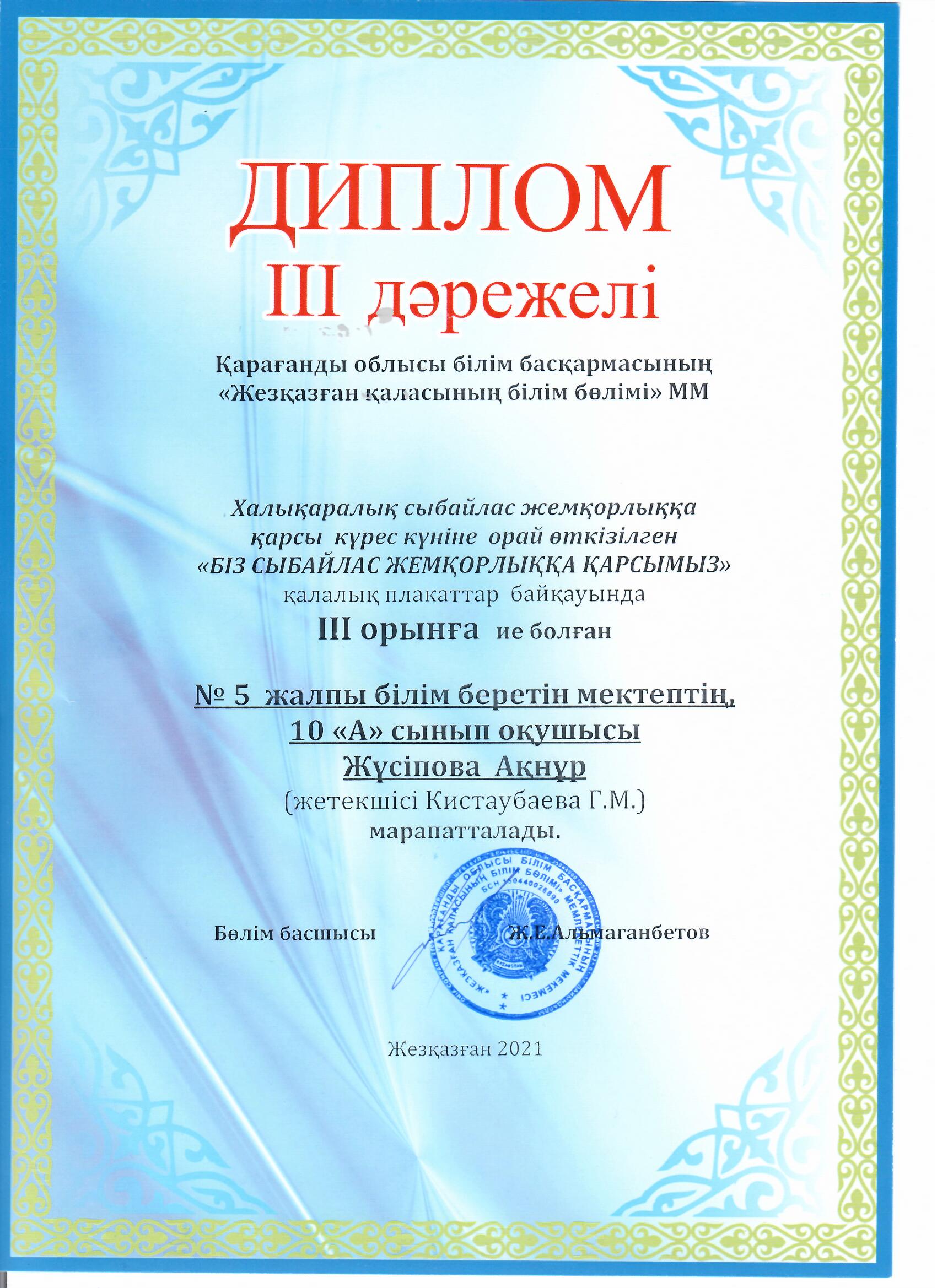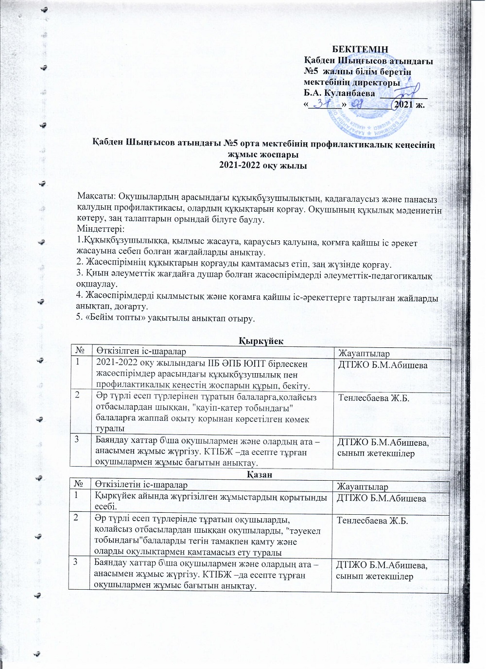 Қабден Шыңғысов атындағы №5 жалпы білім беретін мектебінде 2021 жылдың 14-15 қыркүйек күндері Жезқазған қалалық ПБ ЖПКБ ЮПТ УПИ полиция лейтенанты, Сейтказинова А.М. және ПЮ ЖПКБ ЮПТ УПИ полиция капитаны Тулегенова А.Ж. 1-11 сынып оқушылармен профилактикалық жұмыстар жүргізді . "Құқық бұзушылықтын алдын алу.Темекі қоспаларының, кальянның, нашақорлықтың, энергетикалық сусындарды тұтынудың алдын алу" тақырыбында дәріс оқыды және буклеттер таратты.
