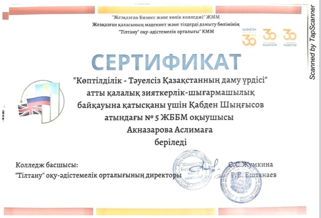 Жезқазған қаласының Қабден Шыңғысов атындағы №5 жалпы білім беретін мектебінде 15 қыркүйек күні 1-11 сынып оқушылары арасында Қазақстан Республикасы Тәуелсіздігінің 30 жылдығына орай «Тәуелсіздік жетістіктері» тақырыбында сынып сағаттары өткізілді.