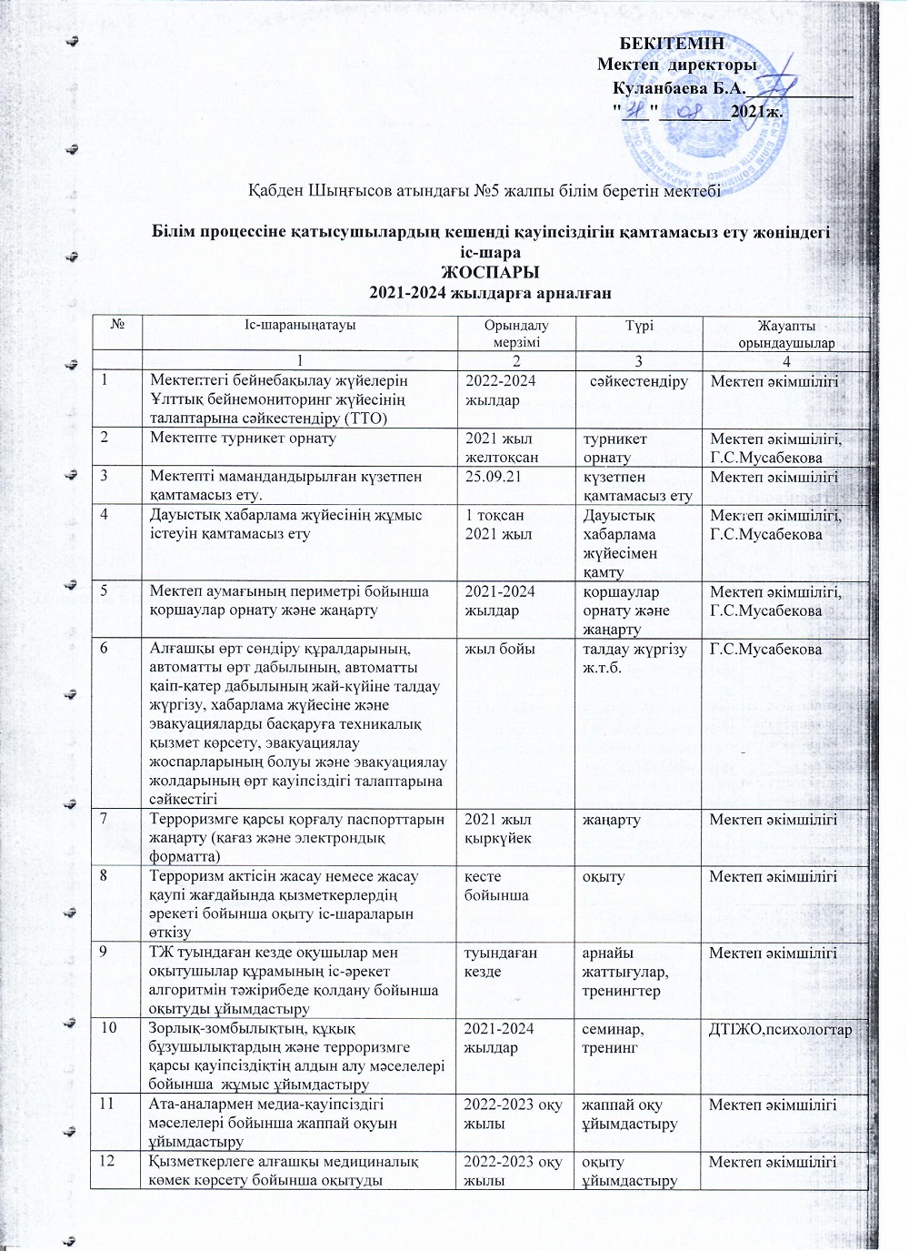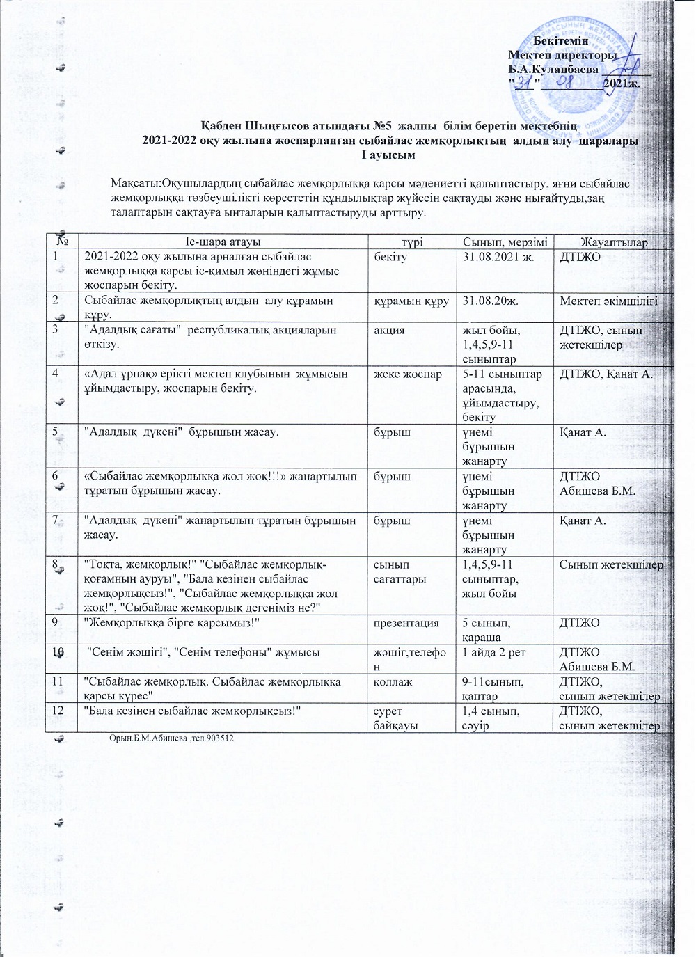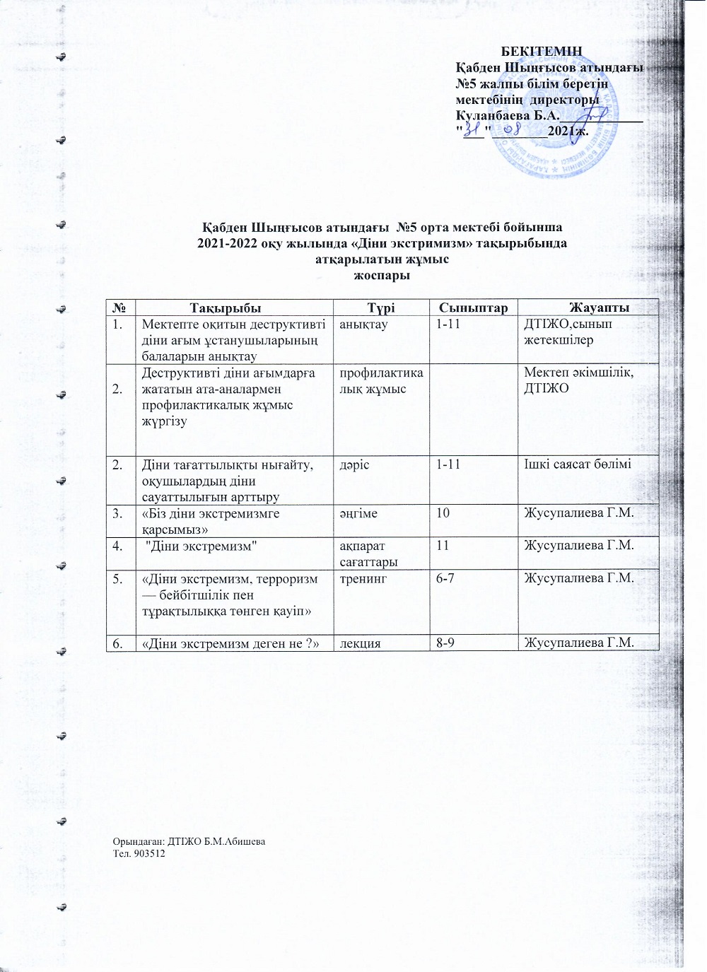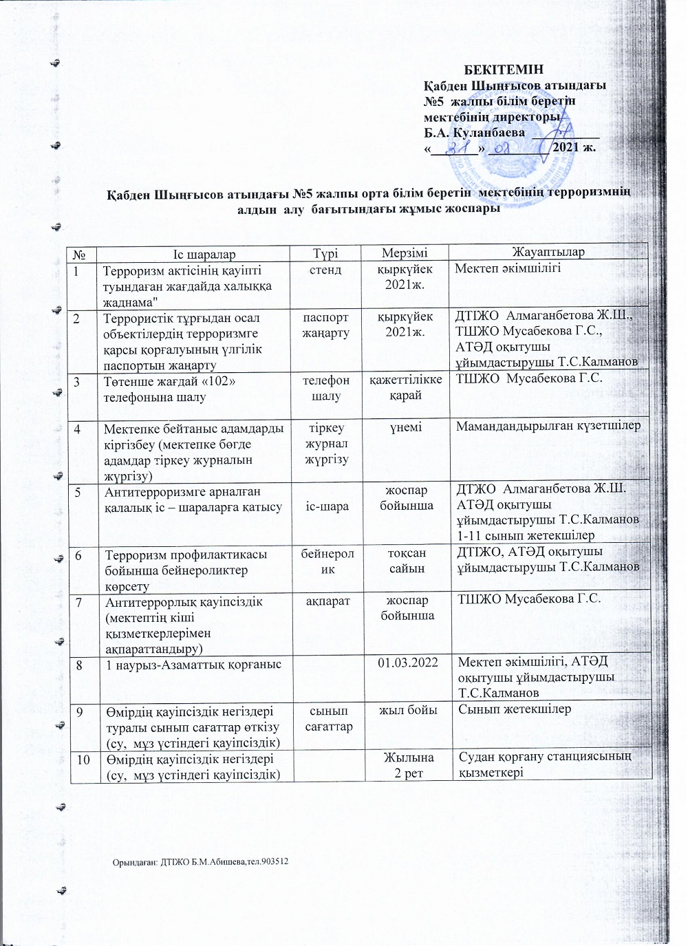 2021 жылдың 28 қыркүйек күні Қабден Шыңғысов атындағы №5 жалпы білім беретін орта мектебінде мектеп вахтерлерімен АӘД пәнінің оқытушы -ұйымдастырушысы Т.С. Қалманов "Объектіде террористік акт жасалған кезде білім беру қызметкерлері мен вахтерлердің іс-қимыл алгоритмі (мектеп,балабақша)" тақырыбында іс-шара өткізді.