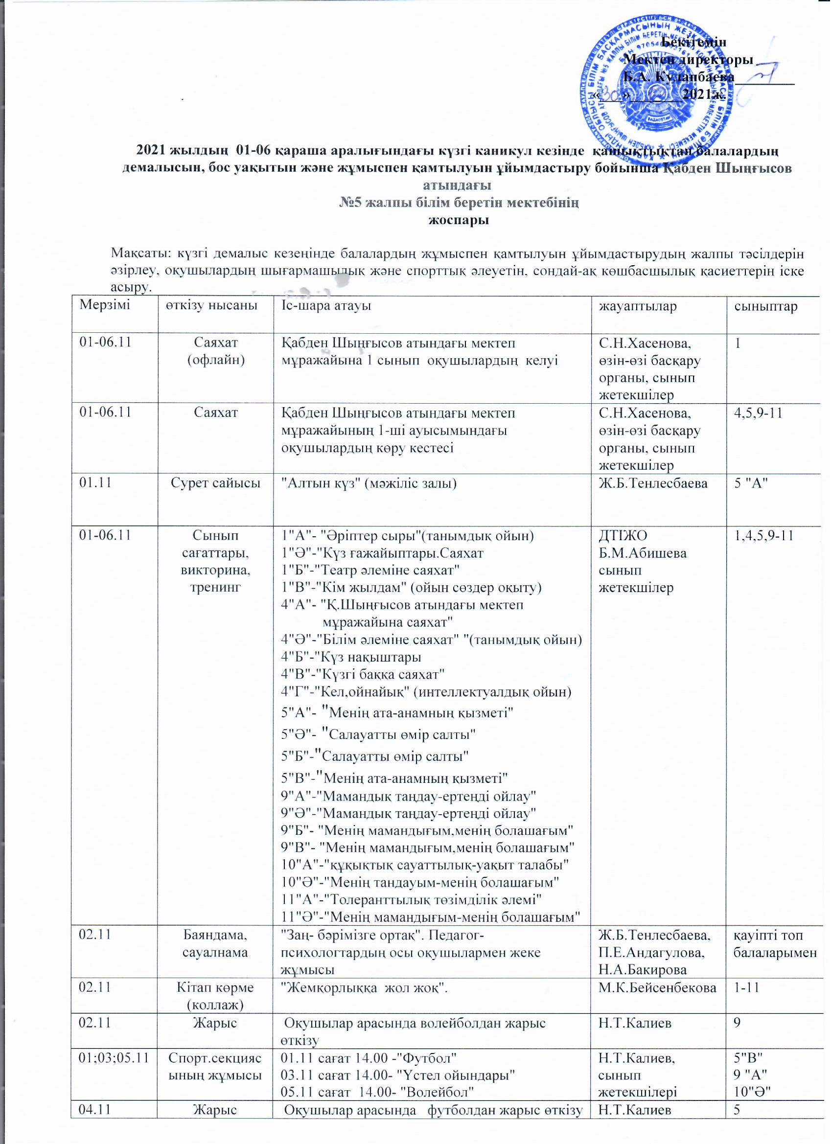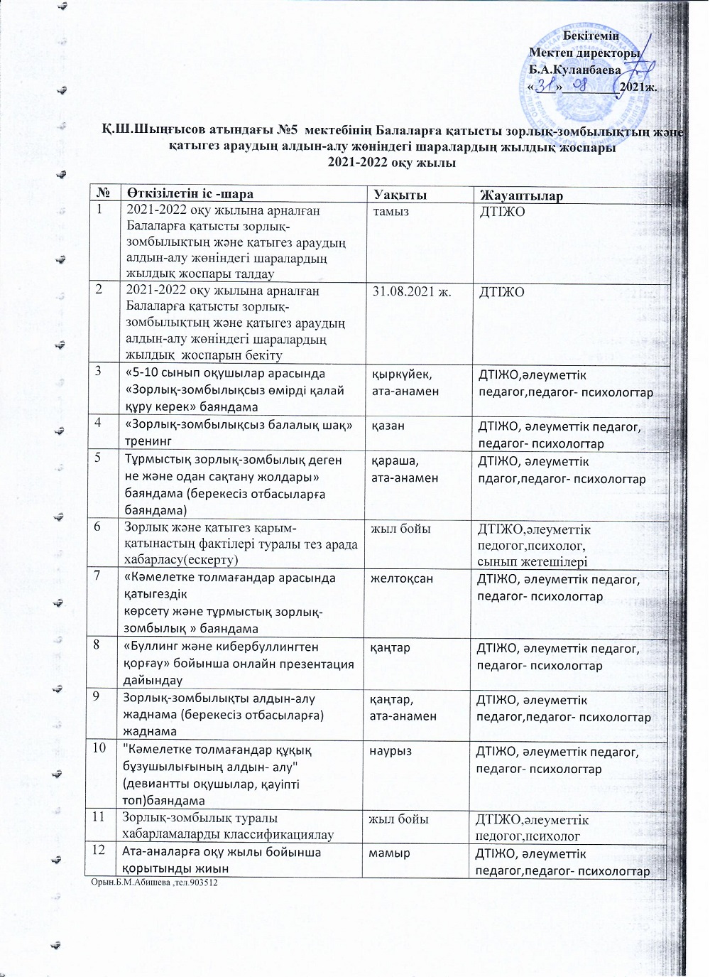 2021 жылдың 15 қыркүйек күні Қабден Шыңғысов атындағы №5 жалпы білім беретін мектебінде 8-11 сынып оқушылары арасында мектеп психологтары Н. А. Бакирова және П. Е. Андагулова "Зорлық - зомбылықсыз балалық шақ" атты іс-шара өткізді