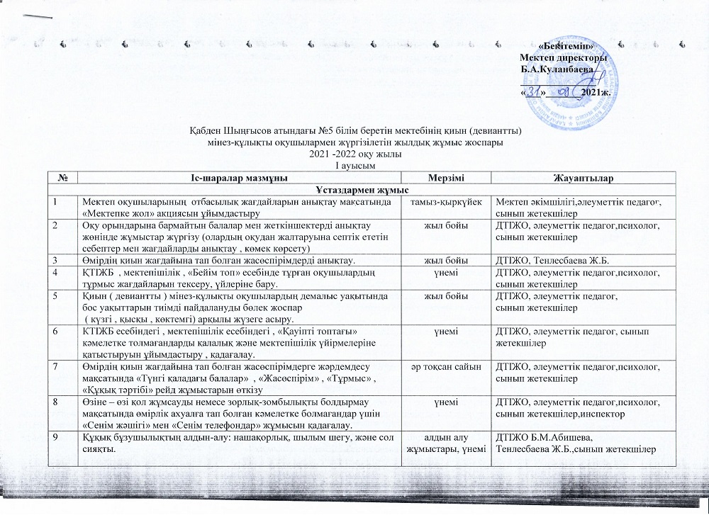 2021 жылдың 14 қазан күні Қабден Шыңғысов атындағы #5 жалпы білім беретін мектебінде ДТІЖО Абишева Б.М.,әлеуметтік педагог Тенлесбаева Ж.Б.,педагог психолог Бакирова Н.А. ұйымдастыруымен "Өз құқығыңды білесің бе?" тақырыбында девиантты мінез-құлық оқушыларымен іс-шара жүргізілді. Мақсаты: Адам құқықтарын сақтау,өз құқықтары мен міндеттерін жүзеге асыруға дайындық қабілеттілігін қалыптастыру.Заңды сыйлауға және өз болашағына жауапкершілікпен қарауға тәрбиелеу.Іс-шара барысында оқушыларға кеңестер беріліп, гербарий жасатылды.