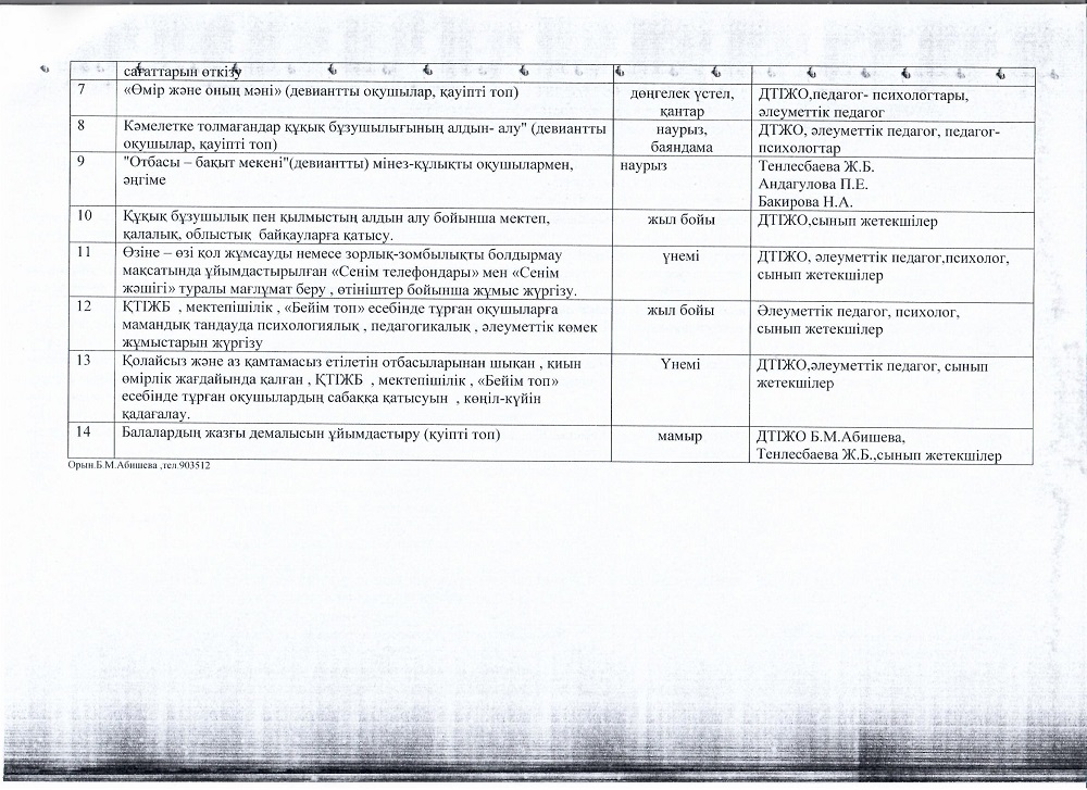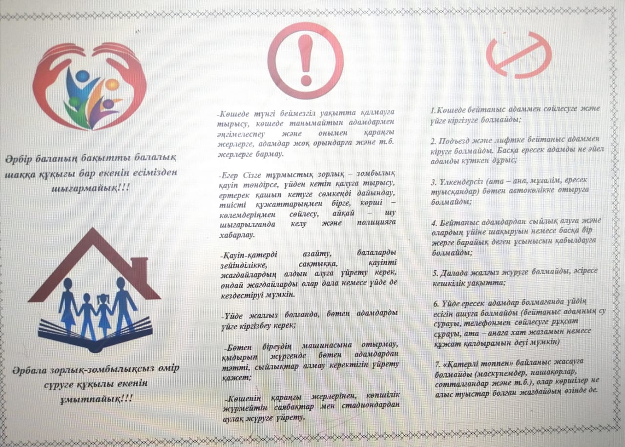 2021 жылдың 10 қыркүйек күні ДТІЖО Абишева Б.М., ДТІЖО Ж.Ш.Алмагамбетова мұғалімдері, Г.Ж. Джакипбекова, А.А. Кабылденова «Түңгі қаладағы балалар» профилактикалық іс-шараға қатысты. Рейд барысында көрсетілген мұғалімдер мен мектеп маңайындағы үйдің төбелерін, подъездерді, бос тұрған ғимараттарды,гараждарға тексеріс жүргізді. Сол сияқты «Наурыз» саябағының айналасы қаралып шықты. Сондай-ақ 5 ауданға 3 оқушыға рейд жүргізілді.Барлық ата-аналармен жеке профилактикалық жұмыс жүргізілді.