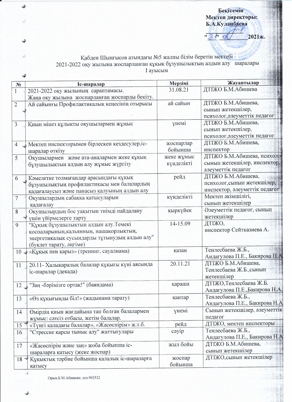 2021жылдың 7 қыркүйек күні Қабден Шыңғысов атындағы #5 жалпы білім беретін мектебінде ДТІЖО Абишева Б.М.,әлеуметтік педагог Тенлесбаева Ж.Б., мектеп психологы Бакирова Н.А. ұйымдастыруымен "Құқық пен қарыз" тақырыбында 5"В" (1ауысым) сыныбымен іс-шара өтті.