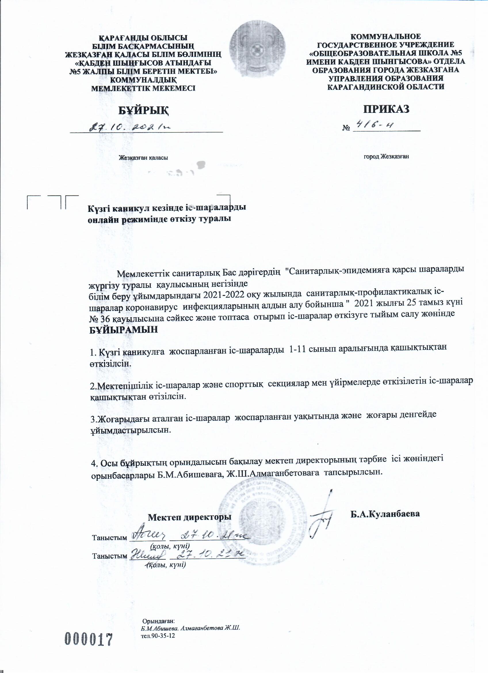 Күз - ең поэтикалық және даулы уақыт.Ол әдемі және түрлі-түсті, бірақ оны оңай мұңайтады.Суық және желді, бірақ жарқын және бай түстермен көзді жылытады. Ол туралы шексіз айтуға болады! 2021 жылдың 17-25 қыркүйек аралығында Қабден Шыңғысов атындағы № 5 жалпы білім беретін мектепте 1 ауысым (1,4,5,9-11) сынып оқушылары арасында "Алтын күз - керемет уақыт!" тақырыбында іс-шаралар өтті ("Күзгі көңіл - күй" саябаққа экскурсия - 1 сыныптар); ("Күз бояулармен бояйды" суреттер байқауы- 4 сыныптар;"Ғажайып күз" табиғи және тастанды материалдан жасалған бұйымдар конкурсы-5сыныптар; "Күзгі рапсодия" ағаштардың, бұтақтардын, шөптердін түрлі-түсті жапырақтарынан суреттер жасау-9-11 сыныптар).